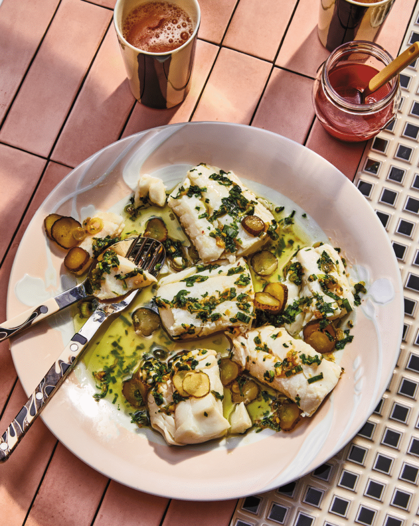 Dill Pickle Poached Cod with Scallion Sauce